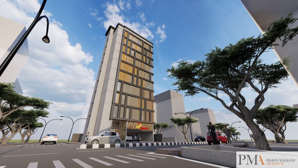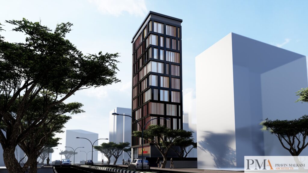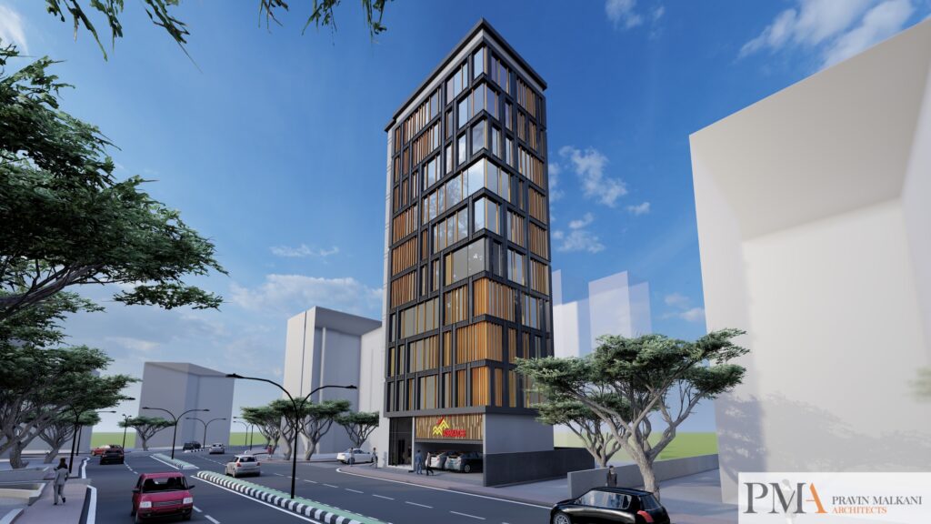 One of the smallest plots of land on which PMA has attempted a corporate office building. The plot admeasures only 215 Sq.Mts only The client’s need was to have his family office in this plot that they have historically owned, however the plot has been severely severed due to the road width expansion done by the local authorities. PMA collaborated with the regulation consultants and structural engineers to fit in a building with a area of 1160 Sq.Mts over Column free and a mechanical parking system for 22 cars. Given the location of the plot, which is close to Mumbai’s CBD the BK Complex, the facade response was a glazed modern building with vertical architectural shading A small but highly challenging plot.