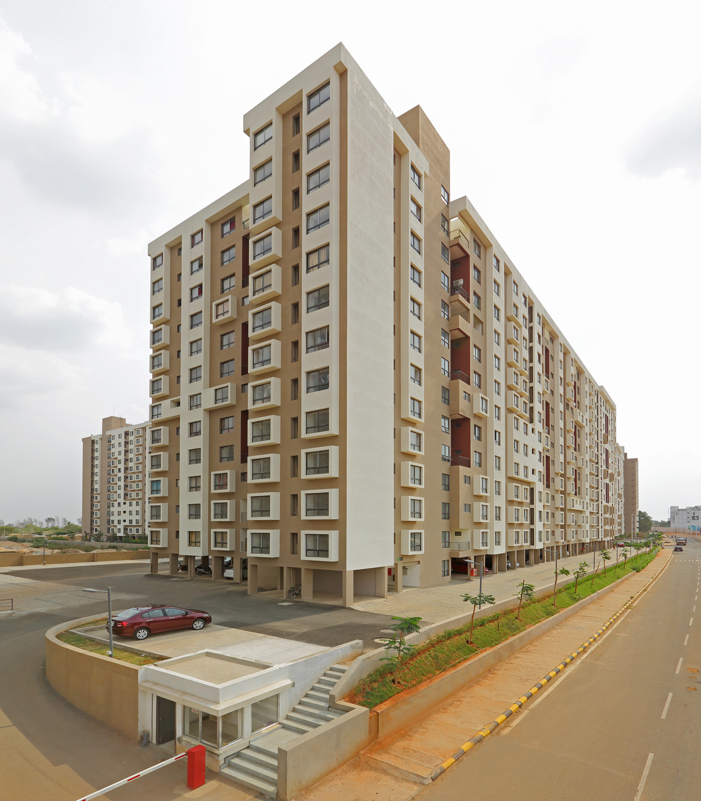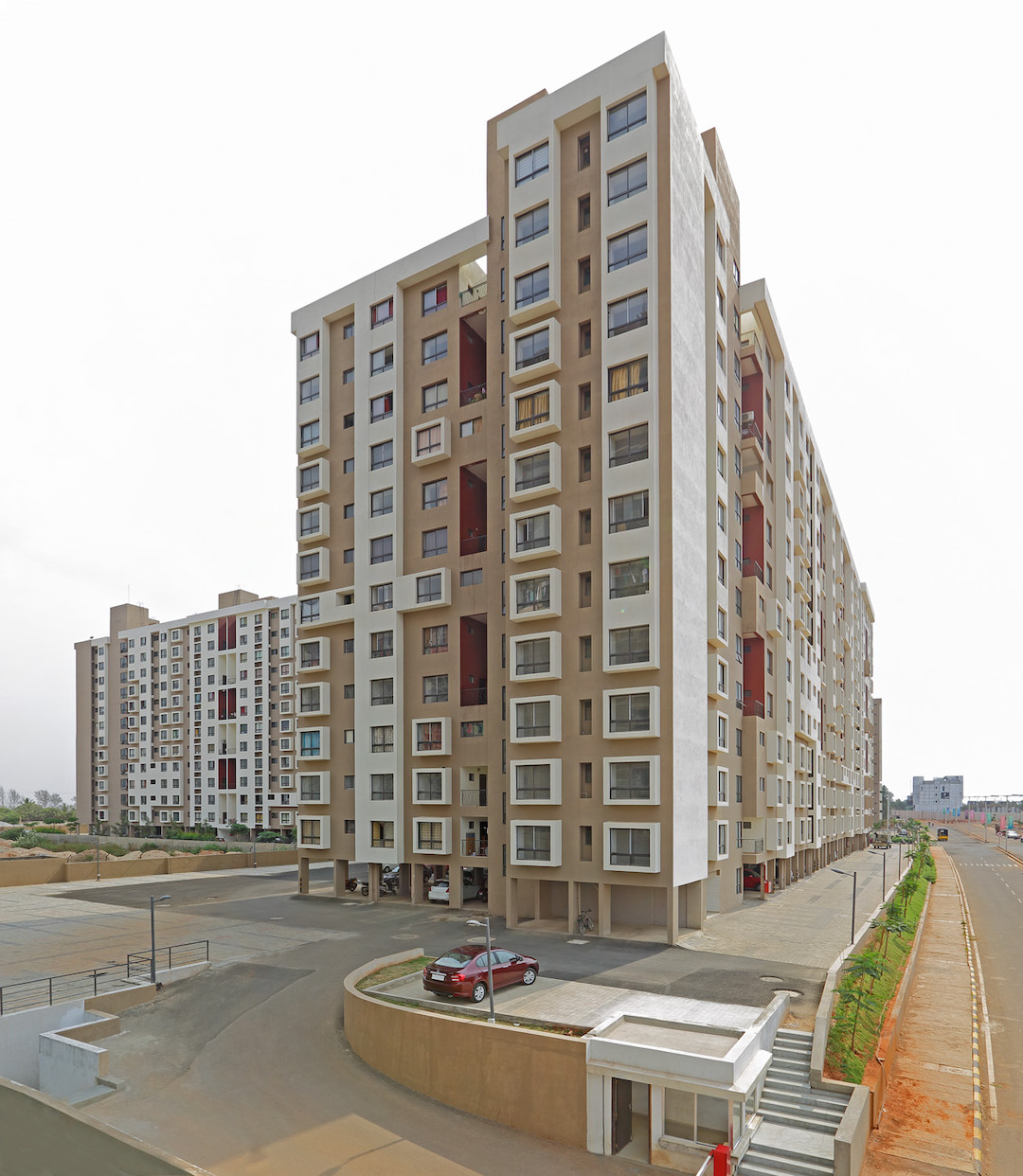 Smondo was one of the most prestigious and proud works, as it required the design team to script a new genre of housing in Bangalore called the SMONDO - Smart Condominium. The use of smart design and efficient use of space make for comfortable living at a comfortable price. The design brief specified unit types of Studio & 1 BHK, 2 BHK & 3 BHK, which is fairly usual. However this brief required the design to be set out in such a grid so as to add the studio to a 1 BHK or a 2 BHK to form a larger home and still not change the facade / elevation.